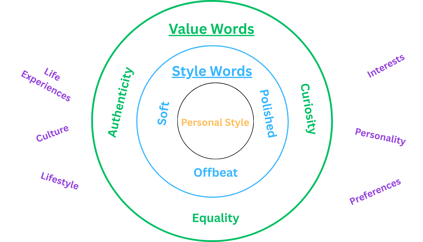 After learning from these and many other stylish individuals, here is how I piece it together: My style words (soft, polished, and unexpected) are the nuts and bolts of getting dressed, and the guardrails to ensure I shop thoughtfully and create outfits with intention. My value words (authenticity, curiosity and equality) provide a zoomed out lens to ensure my outfits are embodied and aligned with who I am.