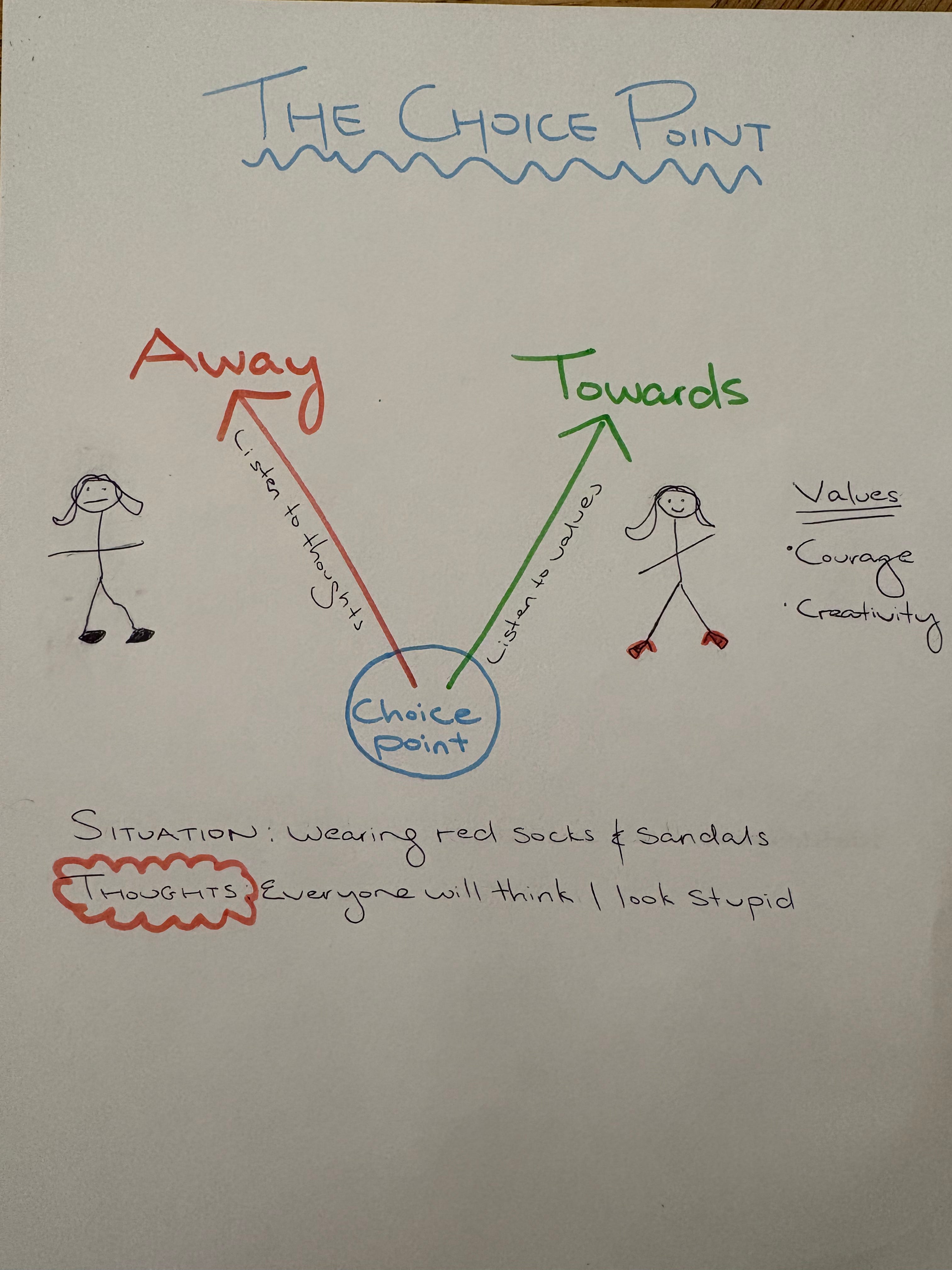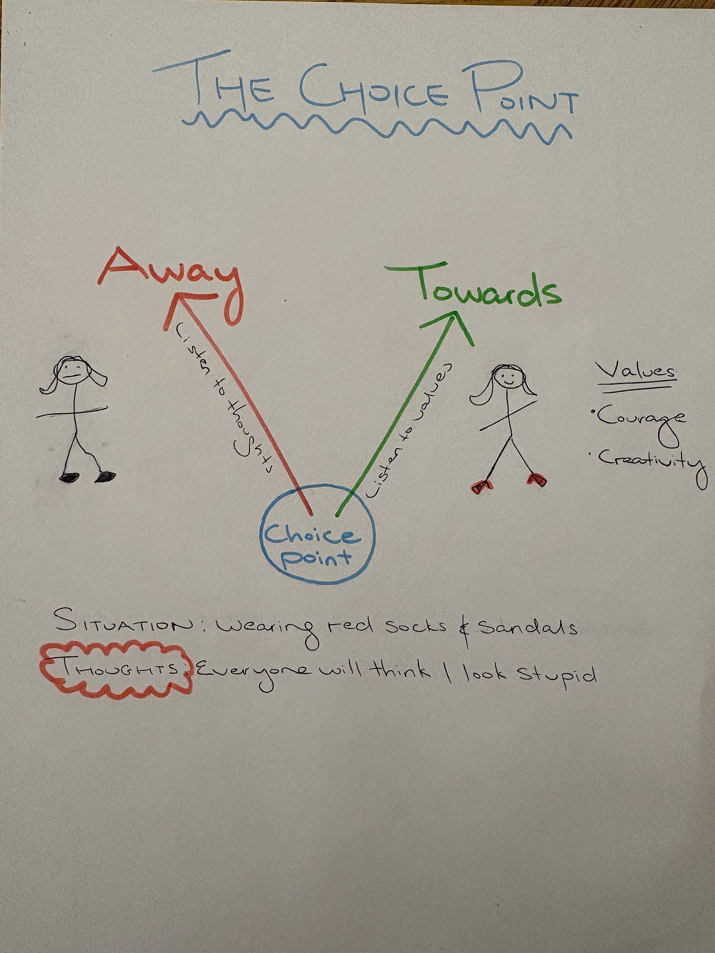 When we start to have these thoughts, we have a choice. Do we listen to our thoughts and make an away move by wearing something ‘safer’? Or do we make a towards move by feeling the fear and wearing the damn socks anyway?